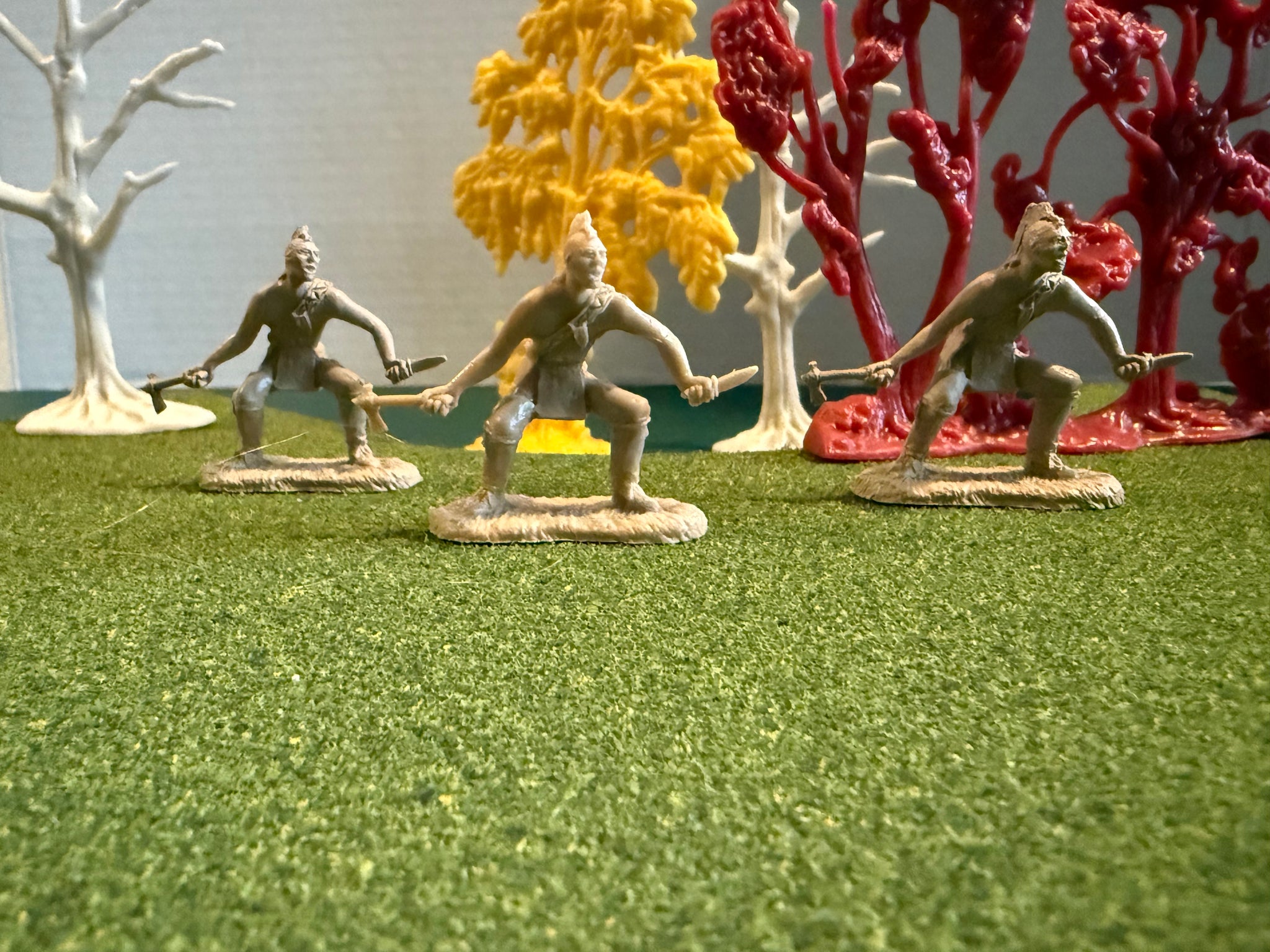 The crouching Mohawk Warrior with a knife and tomahawk signals conflict is near.