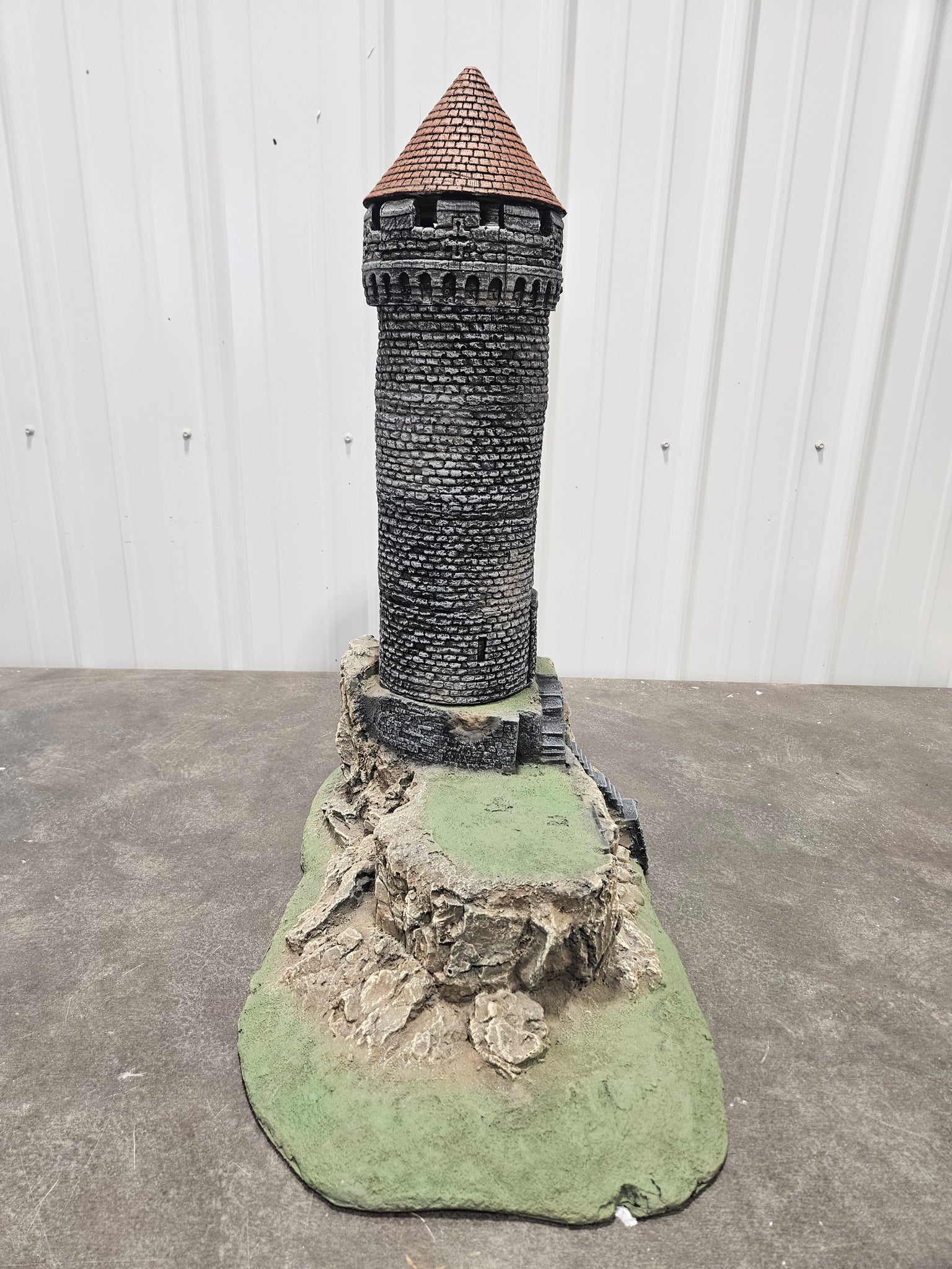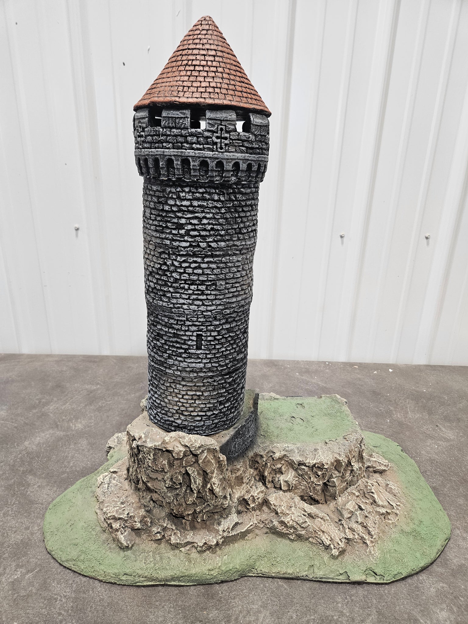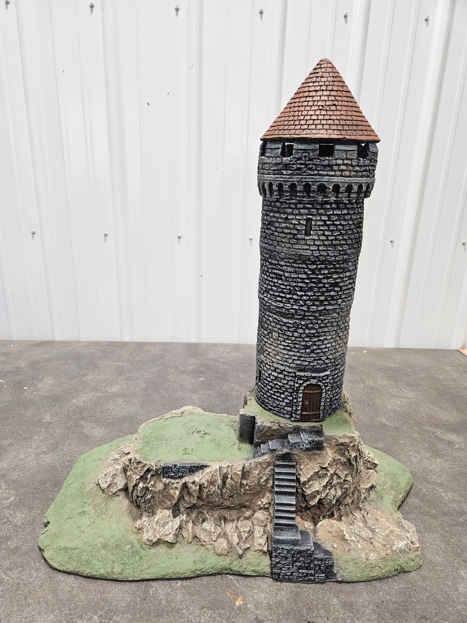 The Watchtower is 16” in height with a diameter of 6”. The conical top is 4” in height bringing the tower to 20” in total.